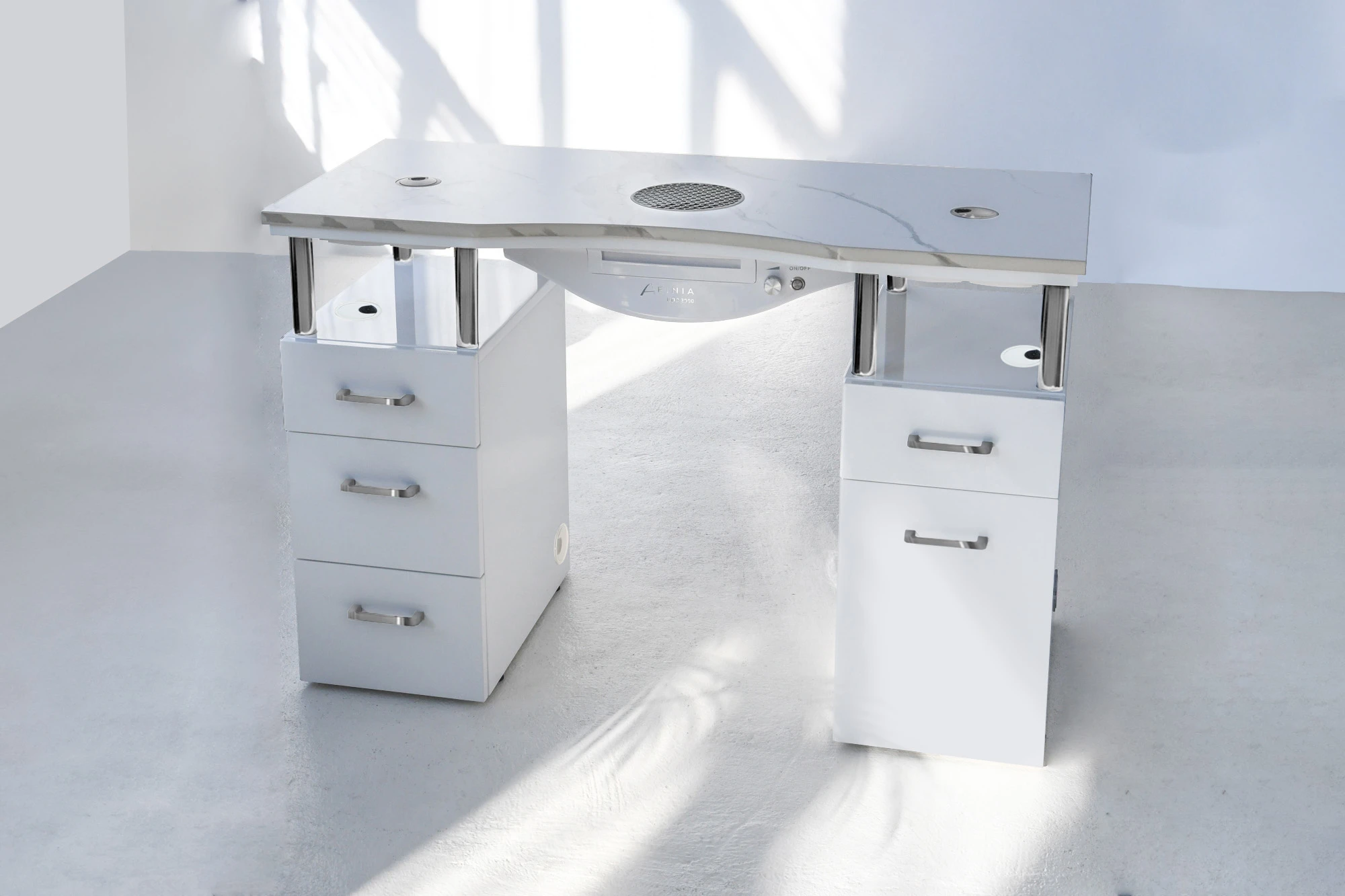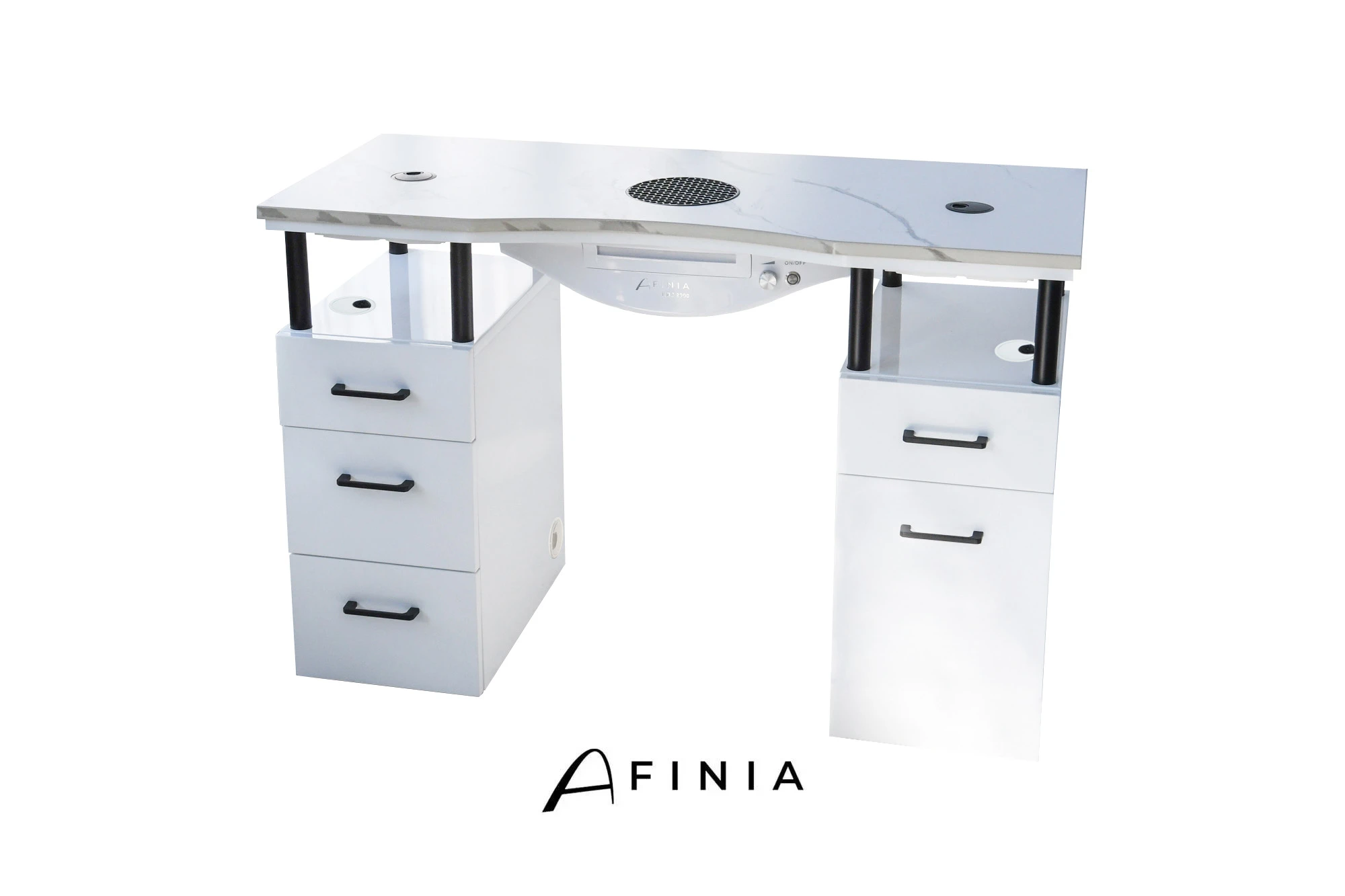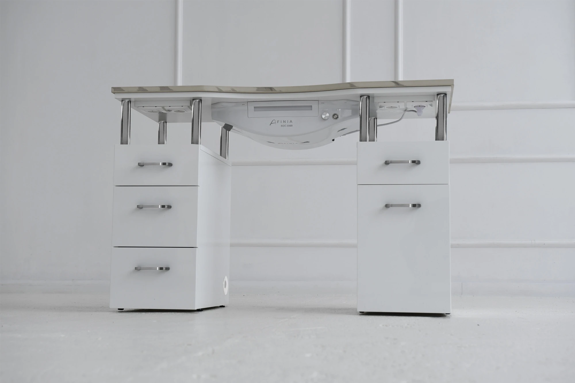 Afinia Basic Quartz Sintered Cosmetic Desk er en funktionel og æstetisk løsning til kosmetiske rum. Dens enkle og universelle design byder på rigelig opbevaringsplads med 5 skuffer. Bordpladen lavet af sintret kvarts garanterer uovertruffen holdbarhed og styrke og overgår markant granits egenskaber. Sintret kvarts er meget modstandsdygtig over for mekaniske skader, hvilket gør det ekstremt vanskeligt at beskadige permanent. Dette gør Afinia Basic skrivebordet ikke kun smukt, men også en pålidelig løsning til enhver skønhedssalon.