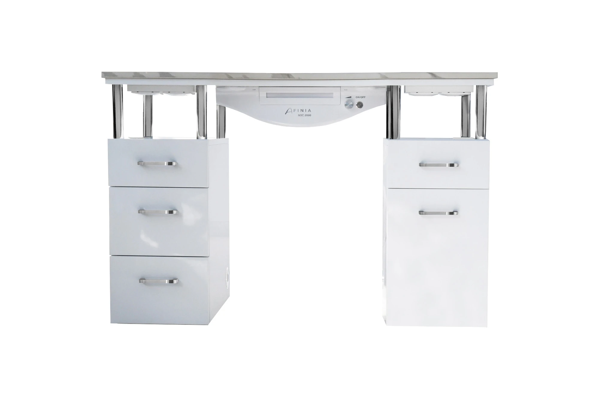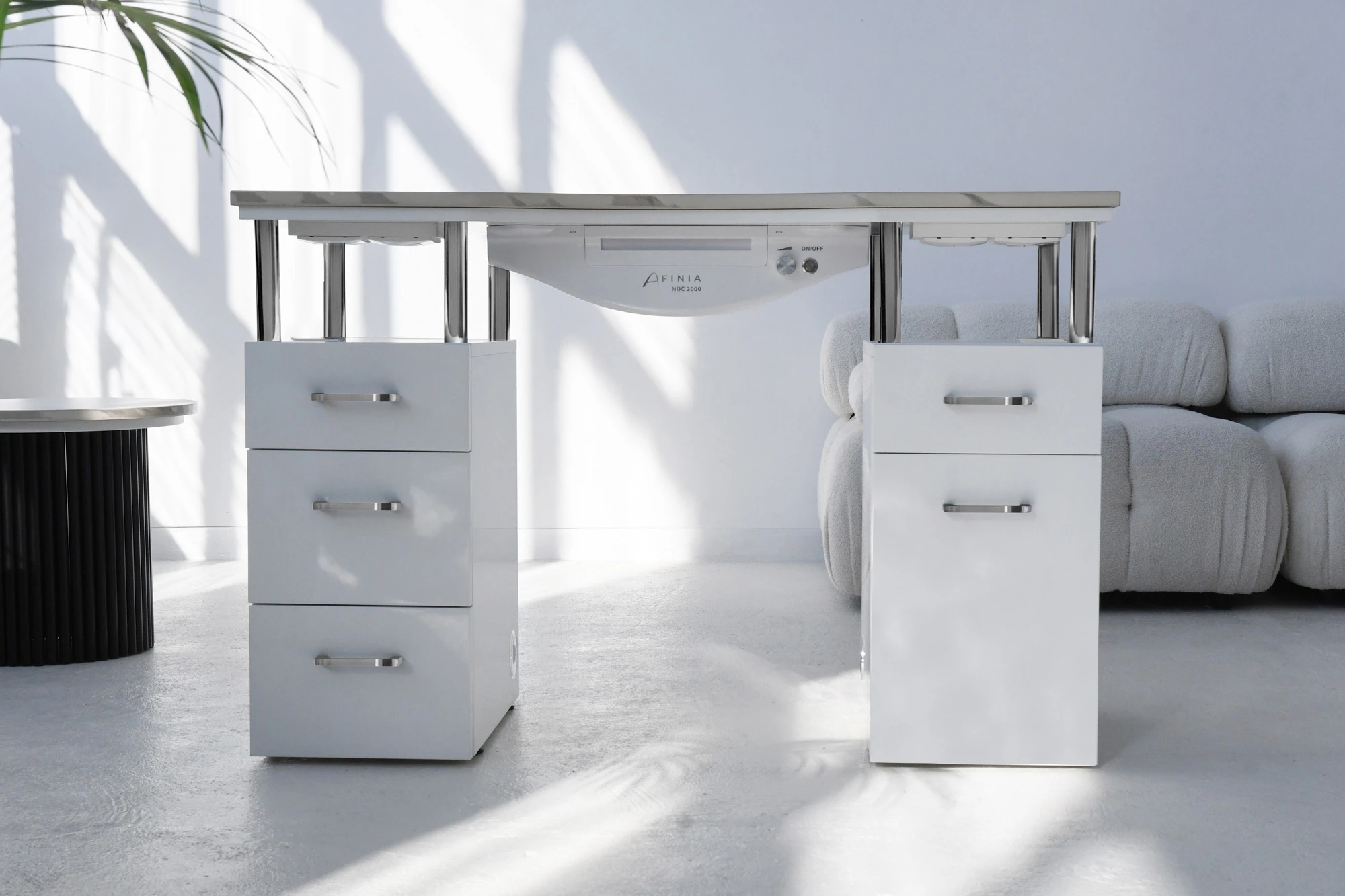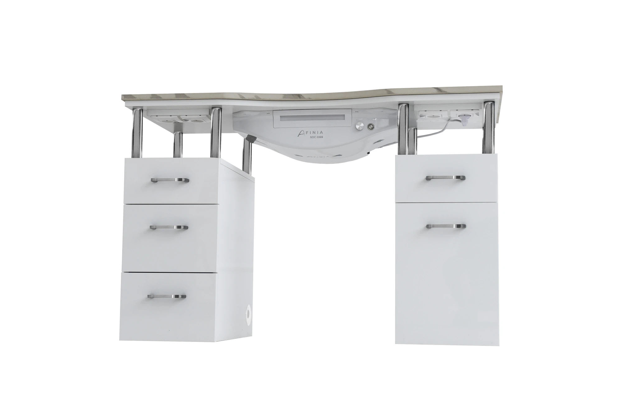 Afinia Basic Quartz Sintered Cosmetic Desk er en funktionel og æstetisk løsning til kosmetiske rum. Dens enkle og universelle design byder på rigelig opbevaringsplads med 5 skuffer. Bordpladen lavet af sintret kvarts garanterer uovertruffen holdbarhed og styrke og overgår markant granits egenskaber. Sintret kvarts er meget modstandsdygtig over for mekaniske skader, hvilket gør det ekstremt vanskeligt at beskadige permanent. Dette gør Afinia Basic skrivebordet ikke kun smukt, men også en pålidelig løsning til enhver skønhedssalon.
